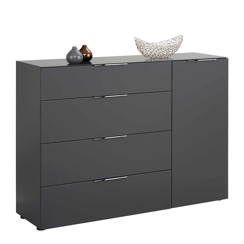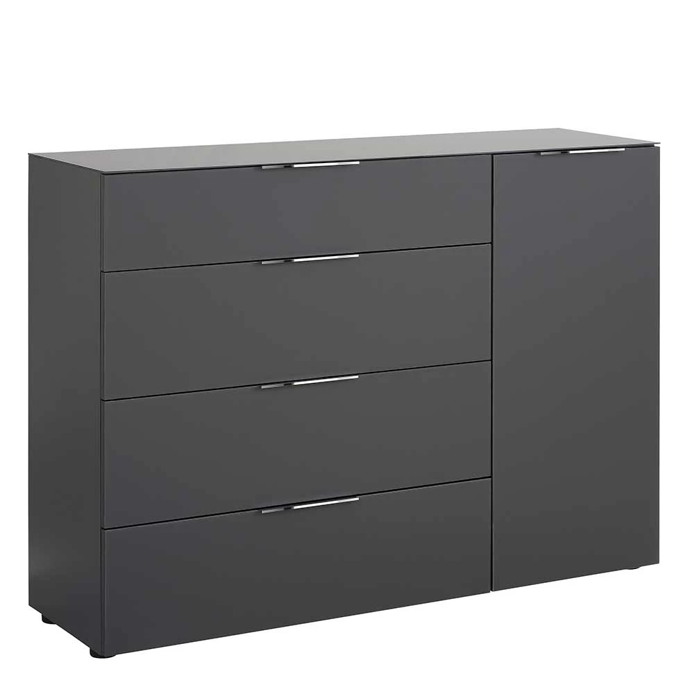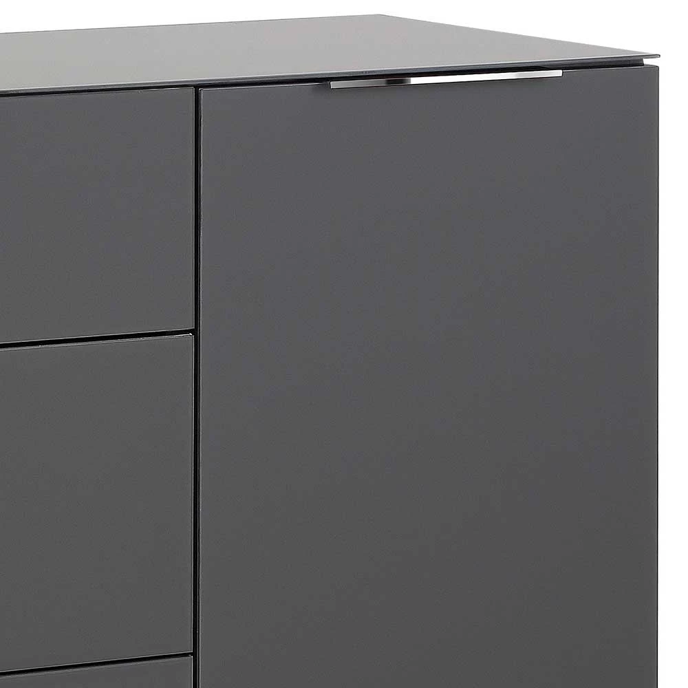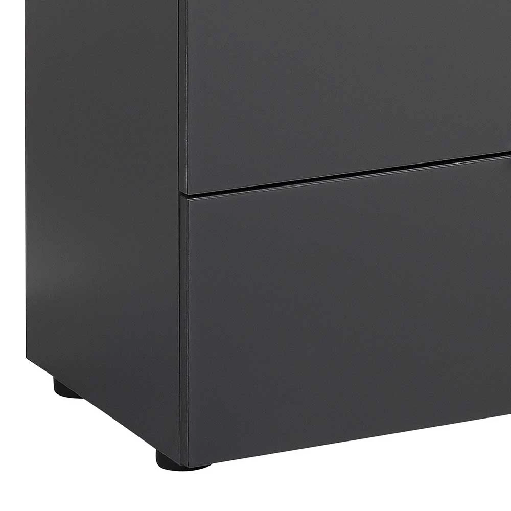 - Oberflächen kratzfest melaminbeschichtet in Anthrazit, Front mit Glas in Anthrazit matt beschichtet, Deckplatte aus Einscheibensicherheitsglas