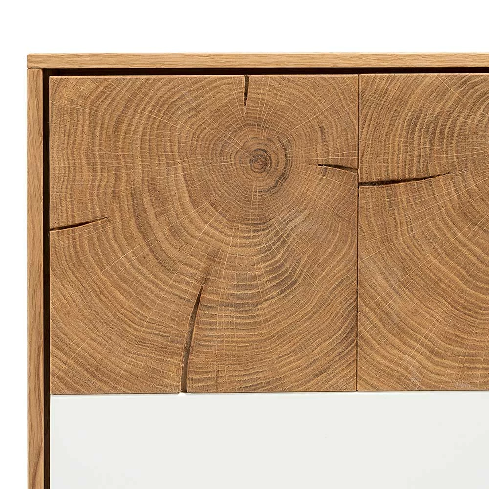 - Holzoberfläche geschliffen und geölt, MDF in matt Weiß lackiert, dekorative Hirnholzabsetzungen mit unikater Struktur