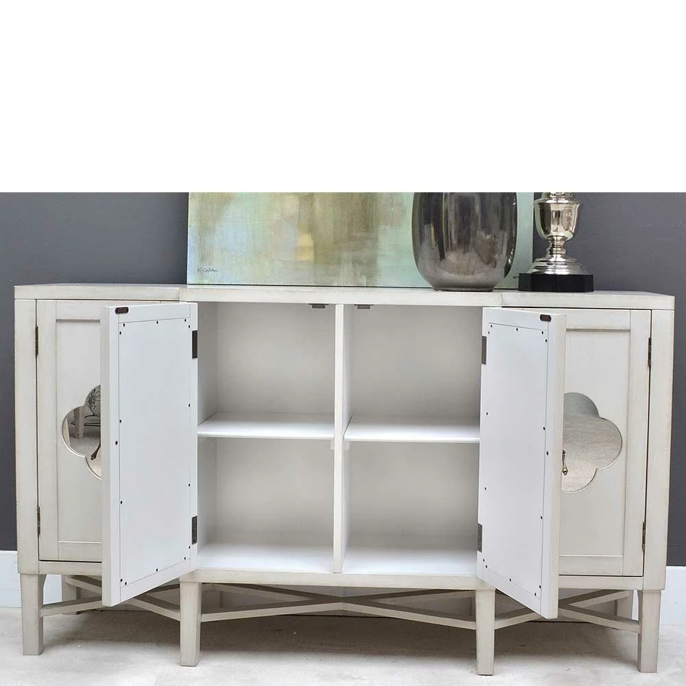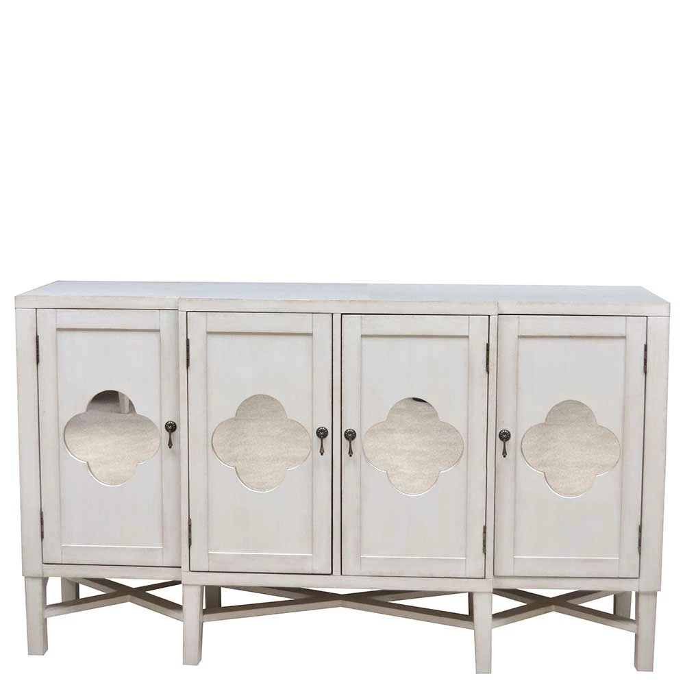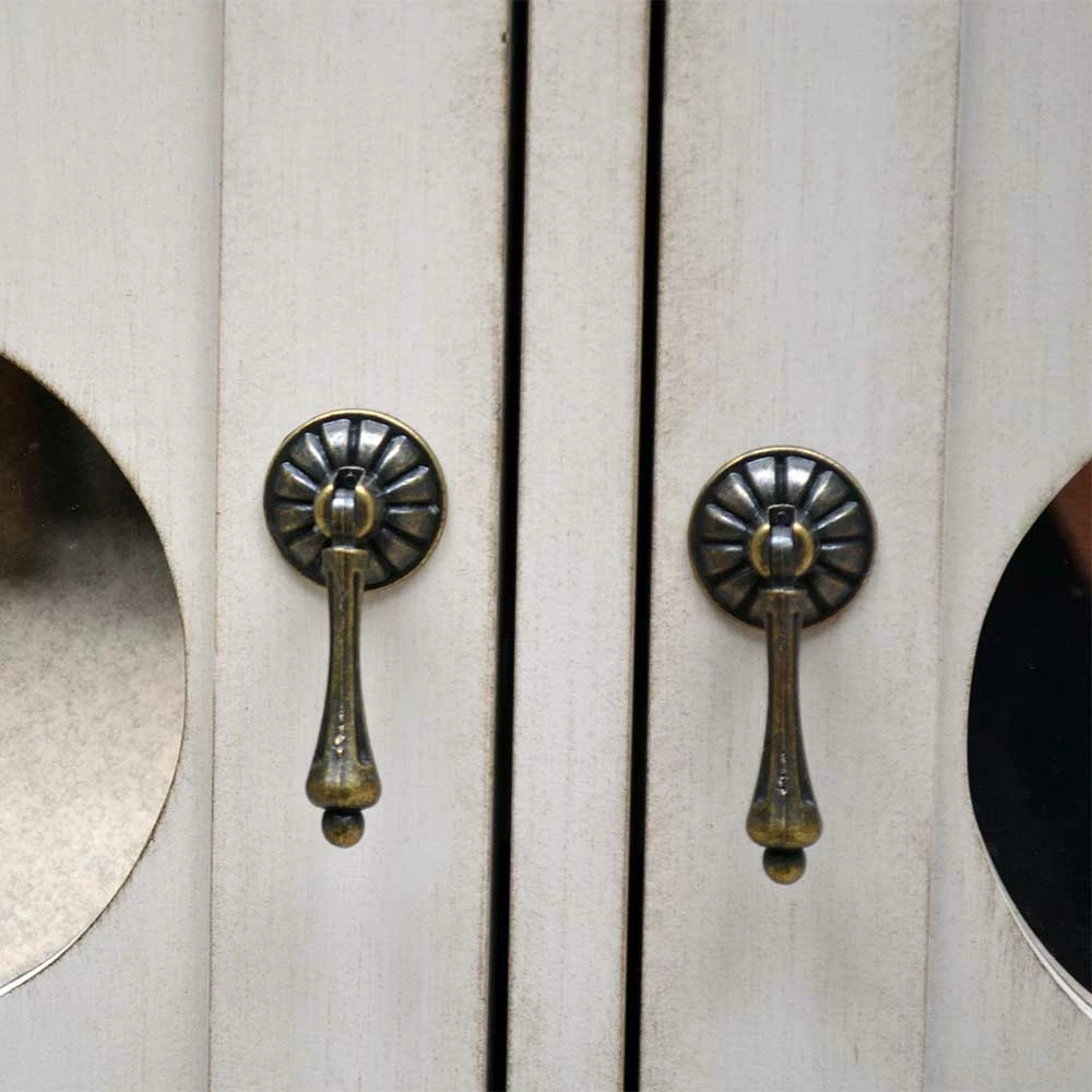 - Oberfläche im Vintage Style antikweiß lackiert, die Front zieren Spiegeleinsätze in dekorativer Ornamentik